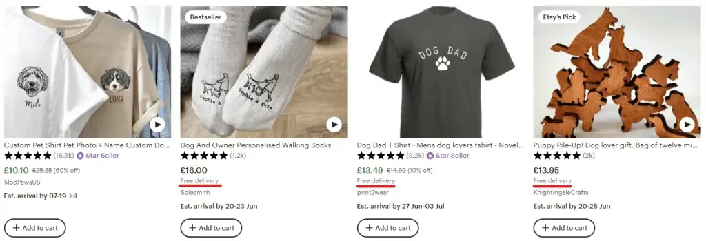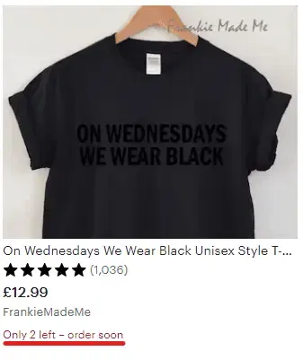 Scarcity is the perception that a product is in limited supply. This can make people more likely to buy a product, as they don’t want to miss out. For example, you might only list a limited quantity of the item in your Etsy Listing. Once you get below 5 Etsy tends to put ‘Only a few left’ under your listing photo when displayed in search results.