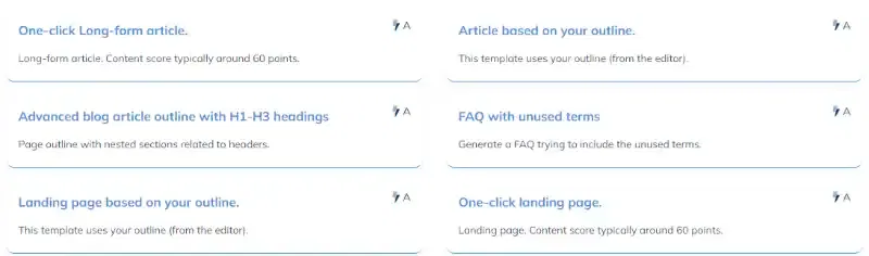 Neuron’s ace up its sleeve is the AI writing functionality that helps get over writer’s block and helps you get going with your article. The AI templates continue to be updated and now include advanced templates that can create SEO optimized content.