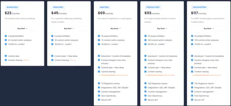 NeuronWriter has a number of price plans for its monthly subscription model with three tiers that increase the functionality that you get.